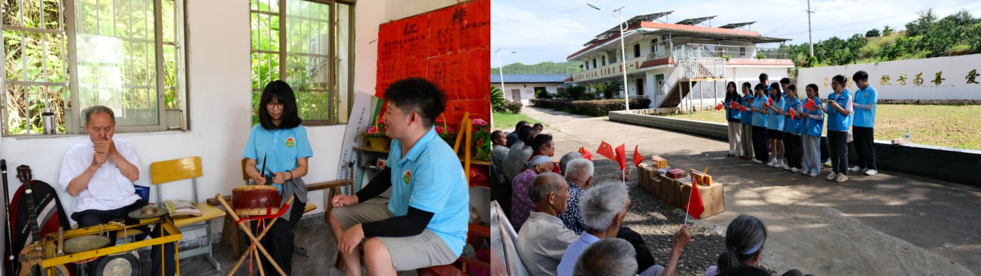 尊老为德,敬老为善、爱老为美,助老为乐,实践队围绕“银龄关怀”开展丰富多彩的敬老服务活动,为当地老人送上一抹关怀。在新水塘村“一老一小”幸福院中,队员们围坐在老人身旁,与老年艺术团成员亲切交流,欣赏节目表演,聆听民俗文化,跟随老艺人学唱戏、唠家常、唱红歌,以文化传承为纽带丰富老年人精神生活。在长安村敬老院,实践队携手当地政府共同开展慰问活动,队员之间分工合作,搬运物资、打扫卫生、表演节目、调研访谈…笑声回荡,一支支小曲、一次次倾听,把青春关怀送进老人心坎的同时,也让大家读懂了“老有所依”的深刻内涵。